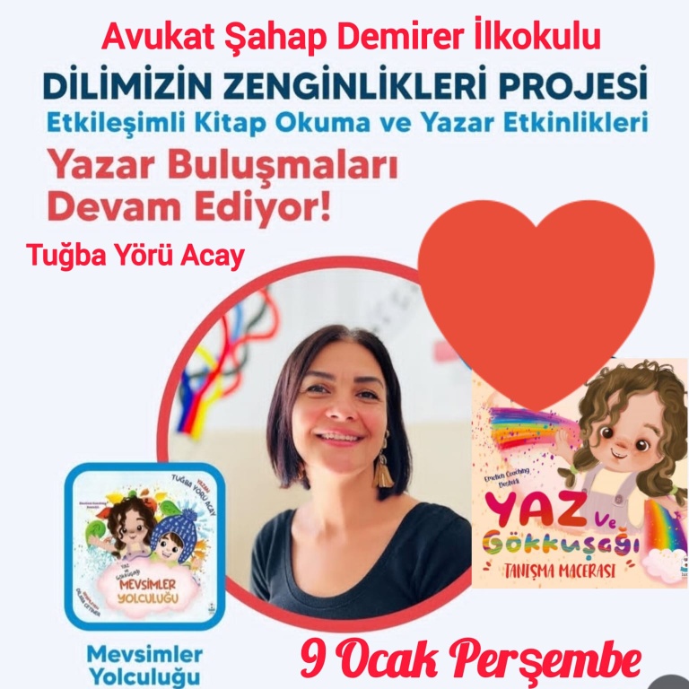 DİLİMİZİN ZENGİNLİKLERİ PROJESİ KAPSAMINDA YAZAR BULUŞMALARI DEVAM EDİYOR. ETKİLEŞİMLİ KİTAP OKUMA ETKİNLİĞİ İÇİN OKULUMUZA KONUK OLAN KIYMETLİ YAZARIMIZ SAYIN TUĞBA YÖRÜ ACAY 'A , ETKİNLİKTE EMEĞİ GEÇEN ÖĞRETMENLERİMİZ SEDA ŞENTÜRK ve YELİZ SEVER'E TEŞEKKÜR EDERİZ.